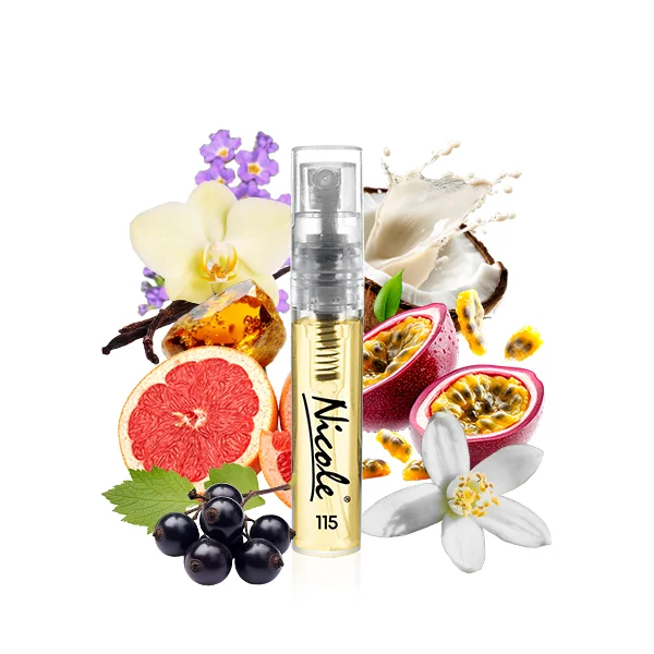 Nicole 115 to kwiatowa kompozycja dla kobiet. Tropikalny i słodki zapach uwodzi subtelną, mydlaną nutą kokosa. Nicole 115 to zmysłowa i dynamiczna kompozycja, która wprowadza w nastrój szaleństwa i zabawy.