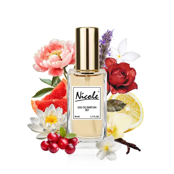 Nicole 157 to wypełnione kwiecistymi esencjami perfumy dla kobiet w górze zapachu kuszą połączeniem energetycznej cytryny, odświeżającego liścia herbaty i żurawiny. Świeża i subtelna kompozycja zapachu, która dodaje radości i energii. Perfumy Nicole 157 dodają elegancji i zmysłowości oraz orzeźwiają.