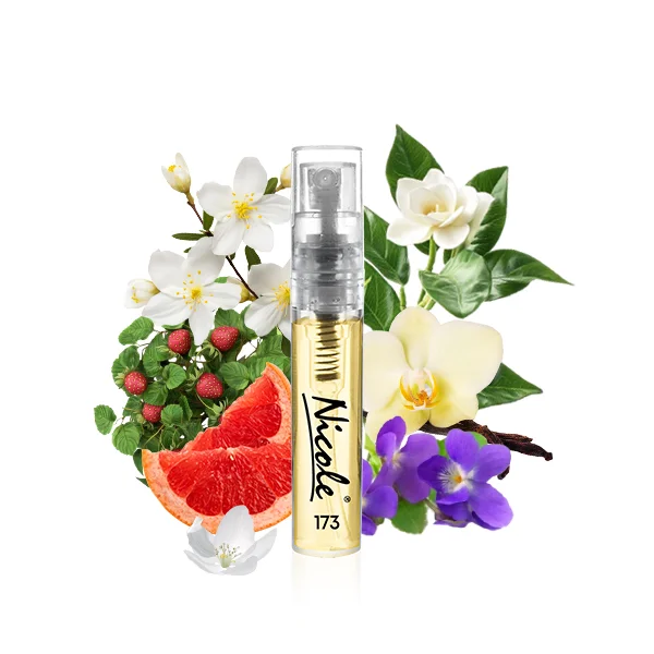 Nicole 173 to połączenie esencji kwiatów, drzew wsparte piżmem. Nicole 173 jest połączeniem słodkich owoców z brzmiącymi różnymi tonami kwiatami. Zapach doskonale nadaje się jako otulająca woń w trakcie letnich i wiosennych miesięcy. Delikatny, pełen optymizmu i energii zapach pasuje dla kobiet i dziewcząt. Pozwoli poczuć się niewinnie, młodo oraz doda radości życia. Młodsze Panie, które go noszą podkreślą poprzez ten zapach swoją figlarność, radość i niewinność.