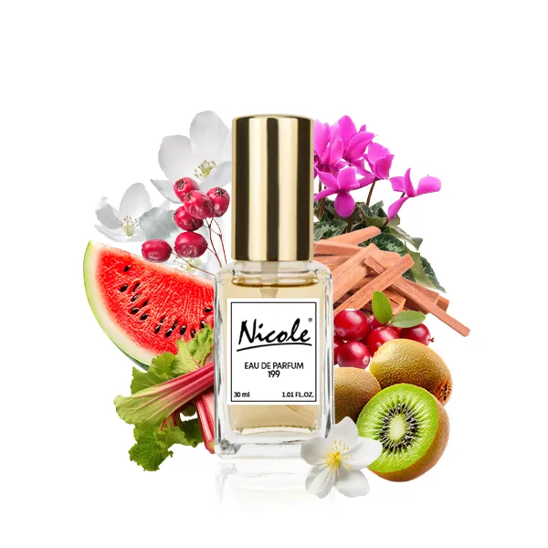 Nicole 199 to kwiatowo-wodne perfumy dla kobiet. Nutami głowy są kiwi, rabarbar i różowy pieprz. Nutami serca są cyklamen, jaśmin i arbuz. Nutami bazy są drzewo cytrynowe, drzewo sandałowe i piżmo. To perfumy dla nowoczesnych i wyemancypowanych kobiet.