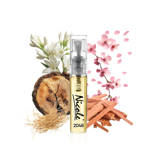 Nicole 2048 należy do kategorii zapachów kwiatowo-drzewnych. To wyjątkowa kompozycja inspirowana japońską sztuką ikebany, która łączy w sobie subtelność kwiatów z głębią drzewnych akcentów. Otwarcie zapachu przynosi nutę herbaty sobacha, nadającą ciepły, prażony charakter. W sercu rozkwita delikatna wiśnia sakura, wzmocniona intensywnością indyjskiej tuberozy, tworząc harmonijną i zmysłową aurę. Bazę stanowi australijskie drzewo sandałowe, cedr i wetiwer, które nadają kompozycji elegancji i trwałości.