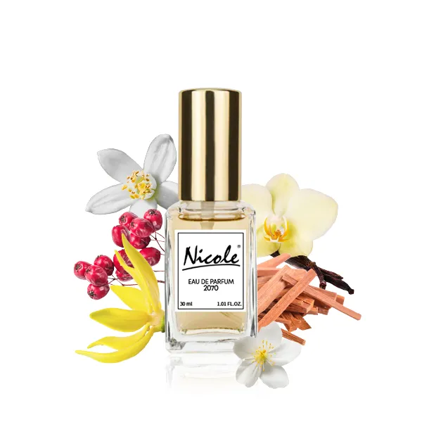 Nicole 2070 należy do kategorii zapachów kwiatowo-drzewno-gourmand. To zapach, który łączy w sobie zmysłowość i siłę, tworząc aurę tajemniczości i elegancji. Otwarcie z różowym pieprzem wprowadza iskrzącą świeżość, która przechodzi w serce z kwiatów pomarańczy, ylang-ylang i jaśminu, nadając kompozycji kremową głębię.