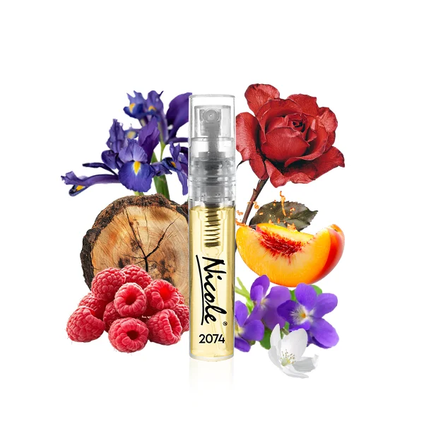 Nicole 2074 to kwiatowy zapach dla kobiet. Nutami głowy są czerwone owoce, malina, róża, fiołek i brzoskwinia; nutami serca są pelargonia różana i irys; nutami bazy są białe piżmo i cedr.