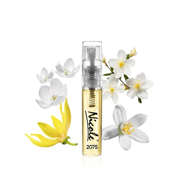 Nicole 2075 należy do kategorii zapachów kwiatowo‑drzewno‑piżmowych dla kobiet. To zapach, który otwiera się czystym, niemal eterycznym piżmem – subtelnym, obiecującym intymność i bliskość. W sercu rozkwitają białe kwiaty: jaśmin, neroli i ylang‑ylang, o delikatnej aurze peelingu… prawdziwej czystości. Baza zaś łączy cashmeran – miękkie drewno otulone pudrową strukturą – zmysłowo podkreślające całość jak aksamitna mgiełka. Całość jest jak dotyk jedwabistej pościeli na skórze – czysta, zmysłowa i trwale pamiętna.
