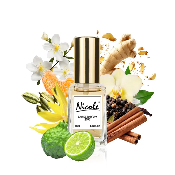 Nicole 2077 należy do kategorii zapachów kwiatowo‑przyprawowych dla kobiet. To kompozycja drenująca jak czerwona szminka — otwiera się eksplozją bergamotki i mandarynki spiętych świeżością imbiru, kardamonu, cynamonu i pieprzu, które wprowadzają intensywność i ciepło.