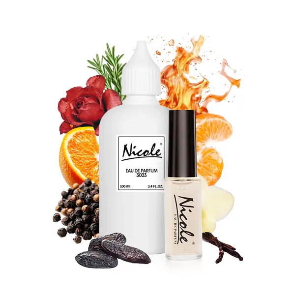 Nicole 3033 należy do kategorii zapachów orientalno-drzewnych z wyraźnymi akcentami cytrusowymi i przyprawowymi. Otwarcie zachwyca nutami mandarynki, cytryny i gorzkiej pomarańczy, które przeplatają się z ostrym akcentem czarnego pieprzu z Madagaskaru i aromatycznym rozmarynem. W sercu zapachu rozwijają się nuty geranium, róży i unikalnego Pepperwood™, nadając kompozycji elegancji i charakteru. Bazę tworzą zmysłowe akordy wanilii, fasoli tonka, paczuli, drzewa sandałowego, cedru teksańskiego, wetiweru haitańskiego i mchu dębowego, które razem tworzą głęboką, otulającą aurę. Nicole 3033 to zapach dla mężczyzny pewnego siebie, pełnego pasji i odwagi, który nie boi się wyrażać swoich emocji.
