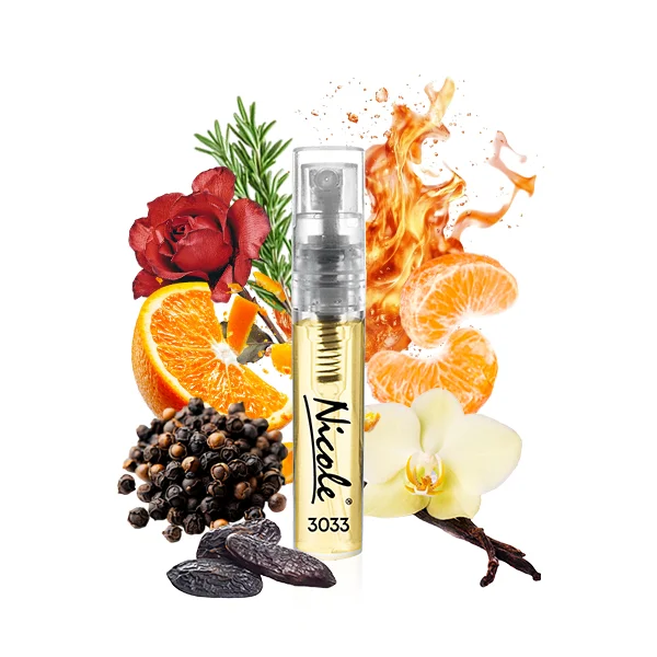 Nicole 3033 należy do kategorii zapachów orientalno-drzewnych z wyraźnymi akcentami cytrusowymi i przyprawowymi. Otwarcie zachwyca nutami mandarynki, cytryny i gorzkiej pomarańczy, które przeplatają się z ostrym akcentem czarnego pieprzu z Madagaskaru i aromatycznym rozmarynem. W sercu zapachu rozwijają się nuty geranium, róży i unikalnego Pepperwood™, nadając kompozycji elegancji i charakteru. Bazę tworzą zmysłowe akordy wanilii, fasoli tonka, paczuli, drzewa sandałowego, cedru teksańskiego, wetiweru haitańskiego i mchu dębowego, które razem tworzą głęboką, otulającą aurę. Nicole 3033 to zapach dla mężczyzny pewnego siebie, pełnego pasji i odwagi, który nie boi się wyrażać swoich emocji.