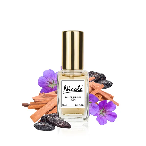 Nicole 3034 należy do kategorii zapachów orientalno-drzewnych. Ten zapach to wyrafinowana kompozycja, w której dominują słodkie i pikantne akordy, tworząc aurę uwodzicielskiej elegancji. W nucie głowy wyczuwalny jest aromatyczny geranium, który wprowadza świeżość i lekkość. Serce perfum wypełnia kremowa tonka, nadając całości głębi i słodyczy. Bazę stanowi ciepłe drzewo sandałowe, otulające skórę aksamitnym, zmysłowym woalem. Nicole 3034 to zapach o wyraźnej projekcji i długotrwałej trwałości, idealny na wieczorne wyjścia i chłodniejsze dni.
