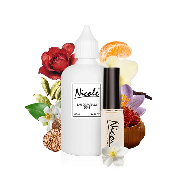 Nicole 3045 należy do kategorii zapachów orientalno-drzewnych. Zapach otwiera się intensywnymi nutami kardamonu, gałki muszkatołowej, neroli i szafranu, które nadają mu pikantny i świeży charakter. W sercu rozwijają się akordy jaśminu, kwiatu pomarańczy, róży, kulfi i mastyksu, tworząc bogatą i kremową głębię. Baza składa się z bursztynu, drzewa sandałowego, wanilii i nut drzewnych, które zapewniają ciepłe i trwałe zakończenie kompozycji.