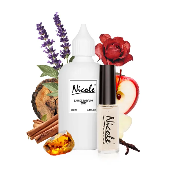 Nicole 3077 należy do kategorii zapachów orientalno-drzewnych. Został wydany w roku 2012. To luksusowa kompozycja, która łączy w sobie bogactwo orientalnych przypraw z głębią drzewnych akordów, tworząc zapach pełen elegancji i wyrafinowania. Otwarcie zachwyca nutami lawendy, zielonego jabłka, cynamonu i palisandru, wprowadzając w świat pełen świeżości i ciepła. Serce kompozycji skrywa aromatyczne nuty róży, konwalii i drzewa cedrowego, oddając esencję kwiatowej delikatności. Baza z drzewa sandałowego, piżma, bursztynu, wanilii i laotańskiego oudu nadaje zapachowi głębi i trwałości, tworząc wyrafinowaną aurę. Nicole 3077 to zapach dla osób poszukujących unikalnych, intensywnych doznań olfaktorycznych, które pozostają w pamięci na długo.