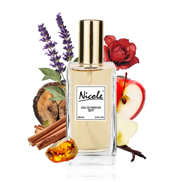 Nicole 3077 należy do kategorii zapachów orientalno-drzewnych. Został wydany w roku 2012. To luksusowa kompozycja, która łączy w sobie bogactwo orientalnych przypraw z głębią drzewnych akordów, tworząc zapach pełen elegancji i wyrafinowania. Otwarcie zachwyca nutami lawendy, zielonego jabłka, cynamonu i palisandru, wprowadzając w świat pełen świeżości i ciepła. Serce kompozycji skrywa aromatyczne nuty róży, konwalii i drzewa cedrowego, oddając esencję kwiatowej delikatności. Baza z drzewa sandałowego, piżma, bursztynu, wanilii i laotańskiego oudu nadaje zapachowi głębi i trwałości, tworząc wyrafinowaną aurę. Nicole 3077 to zapach dla osób poszukujących unikalnych, intensywnych doznań olfaktorycznych, które pozostają w pamięci na długo.