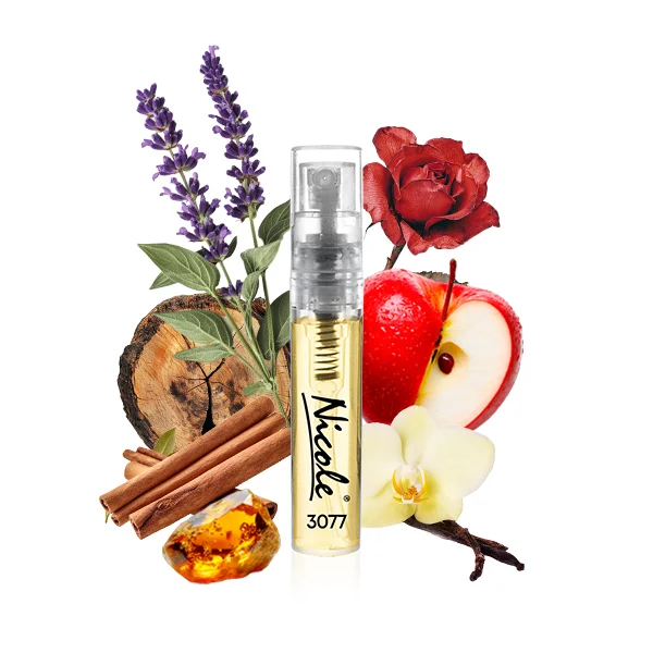 Nicole 3077 należy do kategorii zapachów orientalno-drzewnych. Został wydany w roku 2012. To luksusowa kompozycja, która łączy w sobie bogactwo orientalnych przypraw z głębią drzewnych akordów, tworząc zapach pełen elegancji i wyrafinowania. Otwarcie zachwyca nutami lawendy, zielonego jabłka, cynamonu i palisandru, wprowadzając w świat pełen świeżości i ciepła. Serce kompozycji skrywa aromatyczne nuty róży, konwalii i drzewa cedrowego, oddając esencję kwiatowej delikatności. Baza z drzewa sandałowego, piżma, bursztynu, wanilii i laotańskiego oudu nadaje zapachowi głębi i trwałości, tworząc wyrafinowaną aurę. Nicole 3077 to zapach dla osób poszukujących unikalnych, intensywnych doznań olfaktorycznych, które pozostają w pamięci na długo.