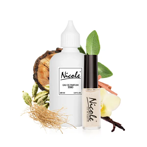 Nicole 3080 należy do kategorii zapachów drzewno-aromatycznych. Kompozycja otwiera się świeżymi nutami szałwii i kardamonu, które nadają zapachowi energetyczny początek. W sercu rozwija się absolut narcyza oraz kwartet wetiweru z Haiti, Urugwaju i Madagaskaru, wprowadzając głębię i zmysłowość. Baza złożona z cedru, australijskiego sandałowca i wanilii z Madagaskaru tworzy ciepłe, otulające zakończenie, które pozostaje na skórze przez długi czas.