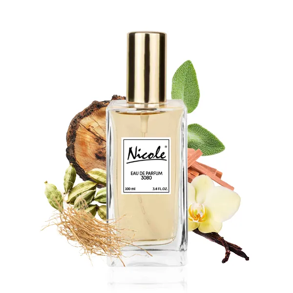 Nicole 3080 należy do kategorii zapachów drzewno-aromatycznych. Kompozycja otwiera się świeżymi nutami szałwii i kardamonu, które nadają zapachowi energetyczny początek. W sercu rozwija się absolut narcyza oraz kwartet wetiweru z Haiti, Urugwaju i Madagaskaru, wprowadzając głębię i zmysłowość. Baza złożona z cedru, australijskiego sandałowca i wanilii z Madagaskaru tworzy ciepłe, otulające zakończenie, które pozostaje na skórze przez długi czas.