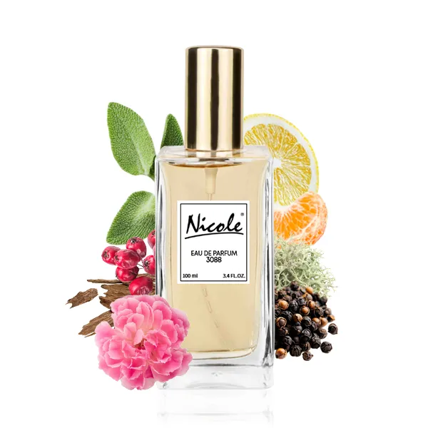 Nicole 3088 należy do kategorii zapachów cytrusowo-przyprawowych z nutami drzewnymi i piżmowymi.To zapach pełen zmysłowego napięcia, który pobudza zmysły od pierwszych nut. Eksplozja cytryny i mandarynki z Brazylii miesza się z pikantną aurą różowego pieprzu i dzikiej szałwii. W sercu unosi się aksamitna róża damasceńska, którą otulają drzewne akcenty oudu i czarnego pieprzu, tworząc hipnotyzującą głębię. Baza z tonkowca, białego piżma, ambry i mchu dębowego zostaje na skórze na długie godziny, budując wokół ciebie aurę tajemniczości.