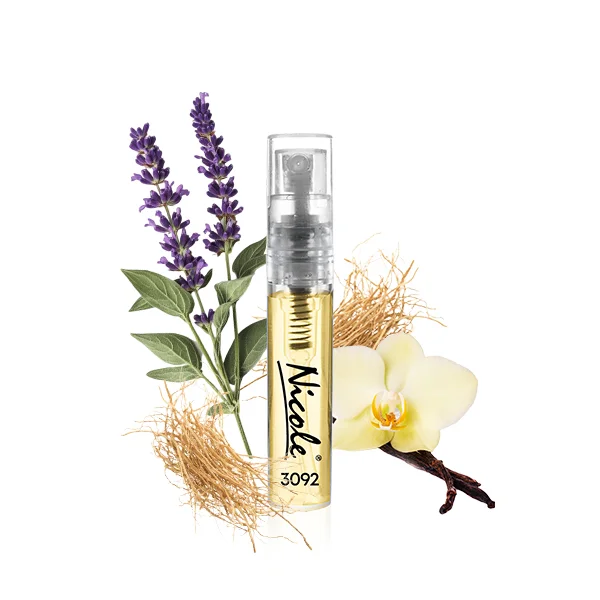 Nicole 3092 to zapach z kategorii aromatyczno-fougère. Otwarcie zapachu przynosi mineralne nuty przeplatane liściem fiołka i solą, tworząc świeże i intrygujące wrażenie. W sercu dominują pikantny imbir i szałwia, nadając kompozycji energetyczny charakter. Baza oparta na drzewnych akordach i wetiwerii zapewnia głębię i trwałość, czyniąc ten zapach idealnym wyborem dla nowoczesnego mężczyzny ceniącego wyrafinowanie i styl.