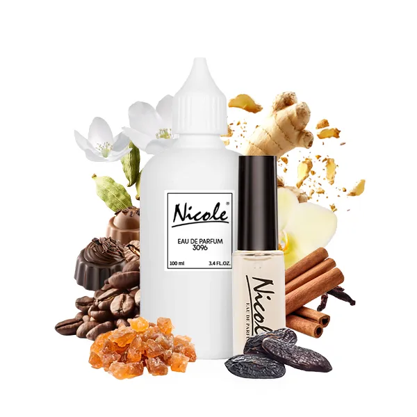 Nicole 3096 należy do kategorii zapachów orientalno-waniliowych. To zmysłowa podróż przez aromatyczne przyprawy i słodycz deserów, inspirowana tradycyjną arabską kawą. Otwarcie zachwyca pikantną mieszanką cynamonu, kardamonu i imbiru, tworząc ciepłe i energetyzujące wrażenie. W sercu kompozycji pojawiają się nuty pralin, kandyzowanych owoców i białych kwiatów, dodając jej słodyczy i głębi. Bazę stanowią akordy kawy, wanilii, tonki, benzoesu i piżma, które nadają zapachowi kremowej gładkości i trwałości.