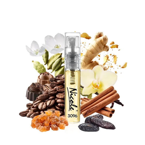 Nicole 3096 należy do kategorii zapachów orientalno-waniliowych. To zmysłowa podróż przez aromatyczne przyprawy i słodycz deserów, inspirowana tradycyjną arabską kawą. Otwarcie zachwyca pikantną mieszanką cynamonu, kardamonu i imbiru, tworząc ciepłe i energetyzujące wrażenie. W sercu kompozycji pojawiają się nuty pralin, kandyzowanych owoców i białych kwiatów, dodając jej słodyczy i głębi. Bazę stanowią akordy kawy, wanilii, tonki, benzoesu i piżma, które nadają zapachowi kremowej gładkości i trwałości.